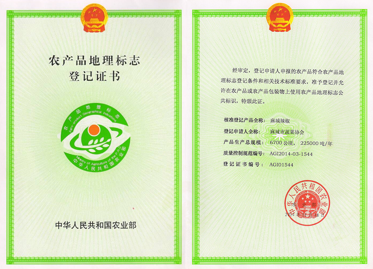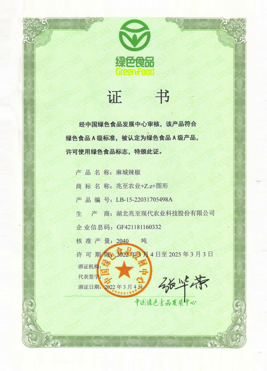 麻城辣椒綠色食品證書